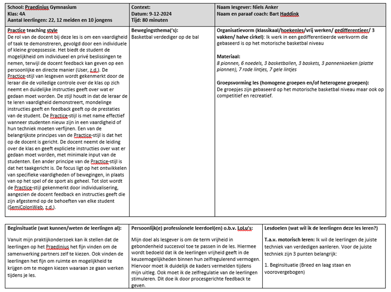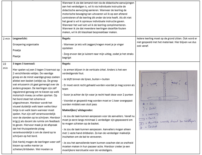Ik heb gekozen voor een basketbal les (gestructureerde les) omdat dit een klas is waarbij je minder vrijheid en meer gebondenheid moet aanbieden. Wel is de klas zelfregulerend genoeg om verantwoordelijk om te gaan met de keuzemogelijkheden met wie ze willen samenwerken en op welk niveau.