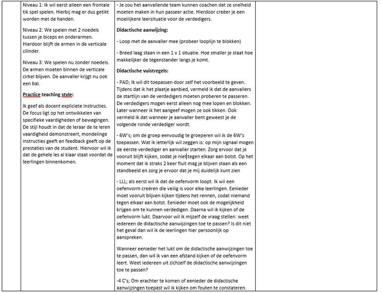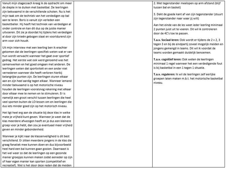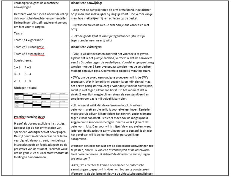 Wanneer ik terugkijk naar mijn gegeven les waren er zeker nog verbeterpunten. Door de doceerstyle die ik heb toegepast heb ik alle kennis en didactische aanwijzingen kunnen benoemen en demonsteren. De doceerstyle heeft mij ook geholpen om de les zo te structureren dat de vrijheid die de leerlingen kregen beperkt bleef. Ik heb 1 keer Joep moeten aanspreken, omdat ik zijn aandacht niet kreeg bij een lesgewricht. Nu weet ik niet of dit iets te maken heeft met vrijheid in gebondenheid. Ik kan dus stellen dat het fijn was om deze doceerstyle toe te passen bij deze klas. Ik heb de leerlingen klassikale keuzes geven (keuze in samenwerking partner & niveau) maar ook individuele keuzes. Zo wouden 2 meiden naar de wc. De 2 meiden mochten van mij tijdens de oefenvorm naar de wc te gaan (vrijheid), alleen mochten zij niet tegelijkertijd naar de wc (gebondenheid). Uit het evalueren met de leerlingen bleek dat de oefenstof te makkelijk haalbaar was. Uit mijn eigen observatie bleek dat de leerlingen de didactische aanwijzingen wel begrepen en ook constant met hun man meeliepen en daardoor tussen bal en basket bleven. Wel vond ik dat 90% van de leerlingen te dichtbij of te ver van zijn man verdedigd. De afstand (armlengte) is dus iets om de volgende keer op door te gaan. Al moet ik wel zeggen dat het heel mooi was om te zien dat de intensiteit van het verdedigen erg hoog lag, terwijl dit normaal veel lager is tijdens een basketbal les. |