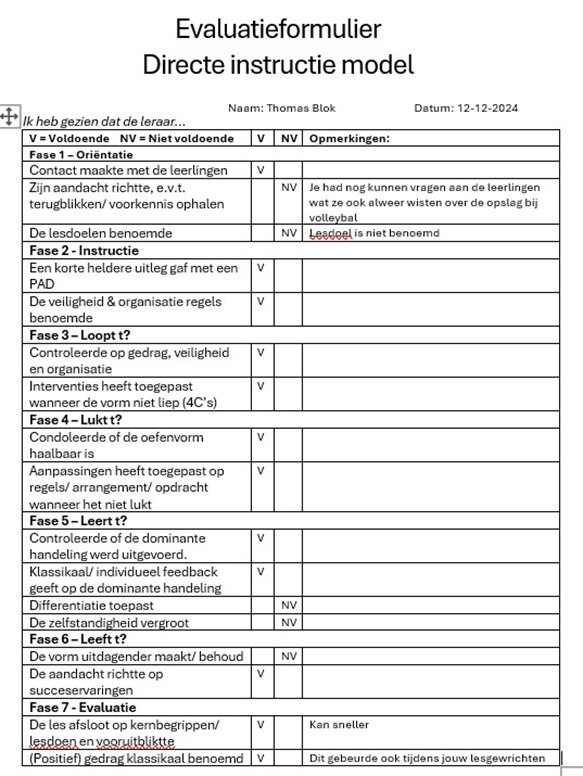 Op de donderdagen 28-11 en 12-12 heb ik een spel lesgegeven. Ik weet van mijzelf dat mijn instructie af en toe chaotisch kan zijn doordat ik te veel wil vertellen. Ik heb les 1 twee keer achter elkaar gegeven. In de eerste les gaf ik de instructie op de manier hoe ik dit normaal zou doen. Na deze les heb ik feedback gekregen op mijn instructie. Ik moest voor mijzelf uittypen in welke volgorde ik de instructie geef. Dit moet dan resulteren op meer rust en volgbaarheid. Bij de les van 12-12 paste ik dezelfde strategie toe voor mijn instructie. In mijn lesvoorbereiding heb ik opnieuw beschreven wat ik precies ga vertellen.