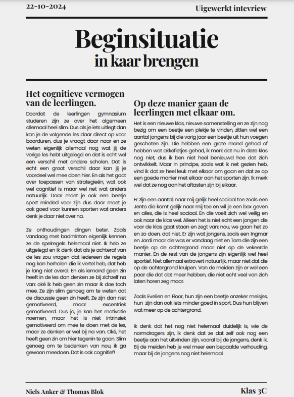 Vooraf heb ik samen met Thomas Blok contact opgezocht met onze stagebegeleider met de vraag of wij samen een klas zouden mogen observeren. Samen hebben wij de les geobserveerd vanaf het moment dat de leerlingen binnenkwamen tot het moment dat de leerlingen de zaal verlieten. Daarnaast hebben wij tijdens de les verschillende leerlingen een formulier in laten vullen. Dit formulier had betrekking op de gemiddelde componenten van de klas. Ook hebben wij na de les onze stagebegeleider geïnterviewd om het beginniveau in kaart te brengen.