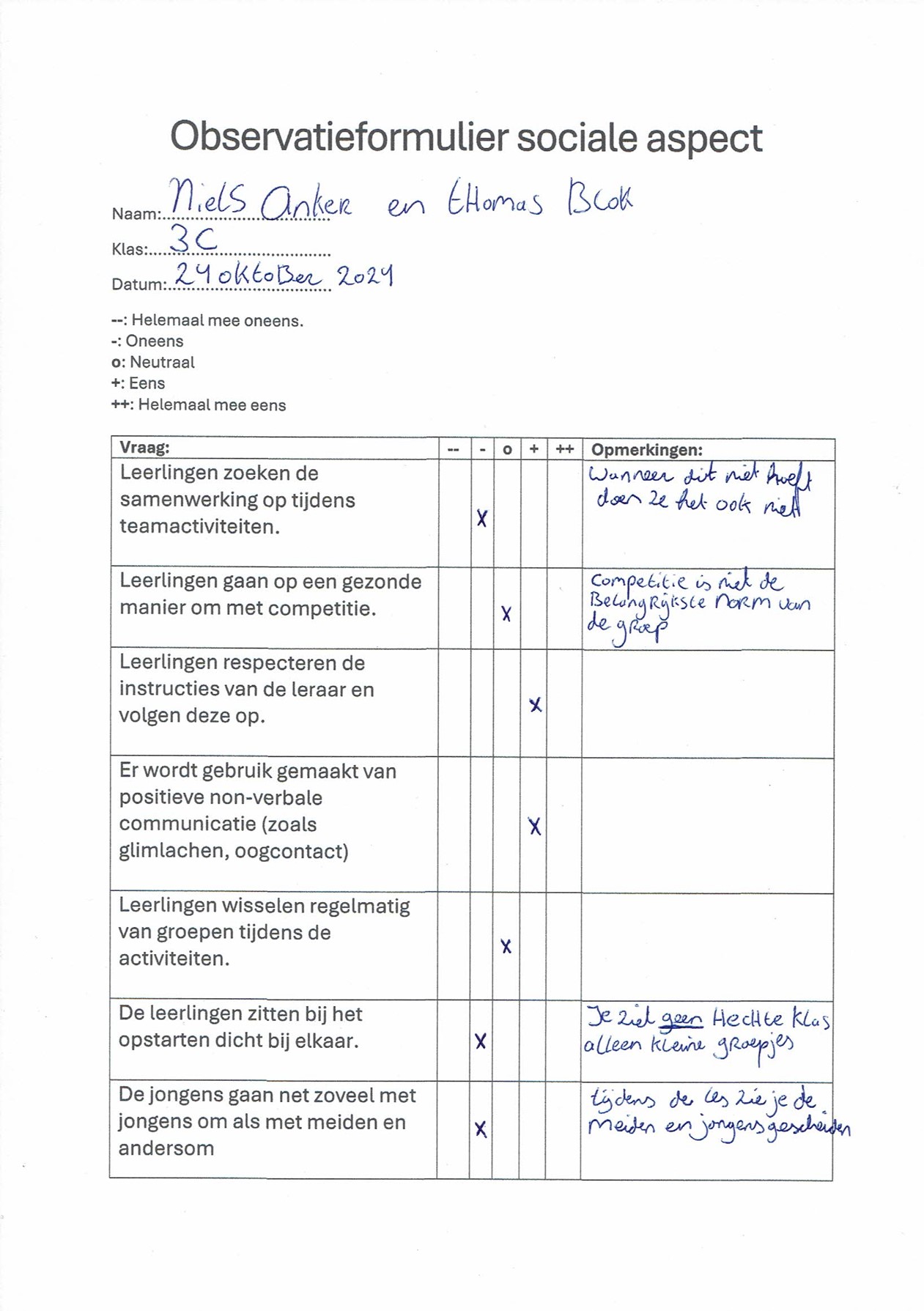 Ook hebben we middels een 2e observatie gekeken of het klopt dat het sociale aspect relatief laag is in deze groep. Hiervoor hebben wij specifiekere vragen gemaakt. Hieruit blijkt dat onze eerste observatie klopt. Het is geen hechte klas. Je ziet meerdere kleinere groepjes en dat is al zichtbaar bij de opstart van de les. Verder zie je geen samenwerking binnen de groep. Het lijkt alsof het ieder voor zich is.