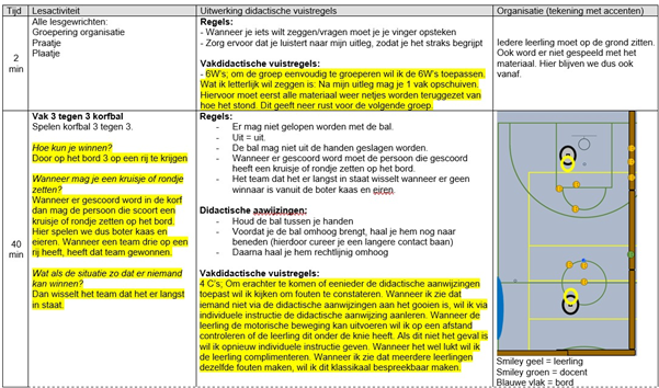 Bij de les van 12-12 heb ik mijn strategie opnieuw toegepast om mijn instructie uit te schrijven. Dit hielp mij door er een logisch en volg baar verhaal ervan te maken. Ook heb ik in deze les mijn leerdoel geformuleerd op verschillende didactische vuistregels. Nu is het zo dat beide vakken een andere doelstelling had voor de leerlingen. Bij het korfballen ging het om de techniek (motorisch) en bij het volleyballen ging het om het reguleren (sociaal). Hierdoor moest ik de 4C’s op verschillende manieren toepassen. De 4C’s toepassen om een vaardigheid aan te leren ben ik al bekwaamd in. Om ervoor te zorgen dat er eerlijke teams werden gemaakt, eenieder evenveel speeltijd krijgt en leerlingen op de bank een actieve rol/bijdrage zouden leveren aan oefenvorm was voor mij nieuw. Tijdens de les was ik hiermee aan het experimenteren. Als eerst heb ik geobserveerd en keek ik naar het zelfregulerend vermogen van de leerlingen. De leerlingen kwamen er gezamenlijk niet uit wie er moesten spelen en wie er op de bank zouden wachten. Ik heb procesgerichte feedback gegeven door vragende wijs de leerlingen helpen/ stimuleren. De leerlingen pakte het direct op en er waren binnen enkele seconden 2 teams van 3 leerlingen in het veld. Het probleem daarna was dat er dus 2 meiden aan de zijkant zaten die direct een gesprek begonnen wat niet over de oefenvorm ging. Hun heb ik ook procesgerichte feedback gegeven door te vragen wat voor rol hun zouden kunnen nemen aan de zijkant. Er was direct effect, want de 2 meiden waren direct bezig met het spel en de punten bijhouden. De 6W’s heb ik ook toegepast tijdens de lesgewrichten en het afsluiten van de les. Tijdens mijn laatste fluitsignaal vroeg ik aan de leerlingen of hun de lintjes en de ballen wouden opruimen. Nu heb ik niet specifiek benoemt waar de materialen heen moeten. Bij deze klas ging het nog goed. Alleen het kan zijn dat er in een andere klas leerlingen zijn die de materialen in de hok leggen maar dit niet netjes doen. De volgende keer wil ik duidelijk benoemen waar het materiaal heen moet. Als feedback kreeg ik mee van mijn stagebegeleider dat het evalueren met de leerlingen nog moeizaam ging. Hier ben ik mee eens. Ik moest mijn best doen om sturing te geven aan het actief evalueren met de leerlingen. Mijn motorische leerdoel kwam moeizaam terug bij de leerlingen en het sociale leerdoel kwamen we niet eens aan toe om die te bespreken. Ik wil de volgende keer werken aan het evalueren met de leerlingen. Ik wil ze actief hierbij betrekken. Dit wil ik laten lukken om directer te vragen wat ze hebben geleerd. Voor deze leeractiviteit ben ik 120 minuten bezig geweest met het voorbereiden en het geven van de les. Ik ben 120 minuten bezig geweest met het uitwerken van de leeractiviteit. Dit is in totaal 4 uur.
