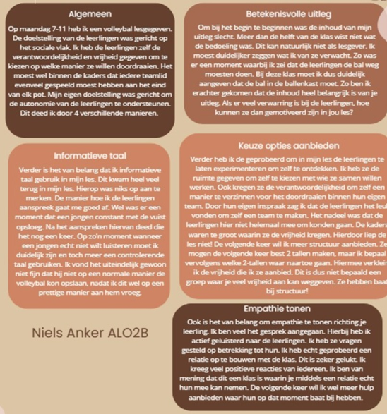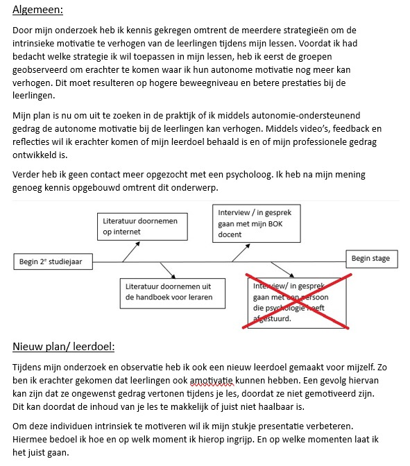 Waar ik achteraf minder tevreden over ben is dat ik niet al mijn leerdoelen bespreekbaar heb gemaakt met mijn stagebegeleiders. Wij hebben vooral gezamenlijk gewerkt aan mijn POP (pedagogisch) en mijn instructies (vakdidactisch). Nu wil ik in het nieuwe semester al mijn leerdoelen bespreken met mijn stagebegeleiders en met hun een passende leerroute hierbij vinden.