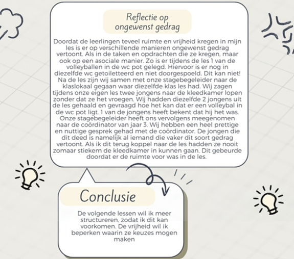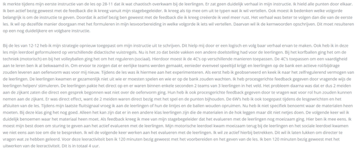 Doordat ik ben blijven reflecteren op mijn handelen heb ik mijzelf kunnen ontwikkelen. Hierdoor heb ik passende oplossingen kunnen vinden om mijn handelen bij te stellen. Door mijn strategieën te blijven hanteren dwaalde ik niet af van mijn leeruitdagingen. Ook weet ik nu dat ik mijn kennis kan verbreden door rekening te houden met verschillende inzichten. Door gebruik te maken van verschillende meetinstrumenten vraag ik nu feedback aan de leerlingen. Normaal gesproken kreeg ik alleen feedback van mijn stagecoach. Ook doordat ik in mijn stageperiode direct begon met opdrachten uit te voeren heb ik er geen haastwerk van hoeven maken.