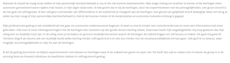 - Brengt zijn ontwikkeling in kaart en relateert die aan zijn professionele omgeving. Hij kan op narratieve wijze belangrijke leerervaringen verklaren en hierbij reflecteren op zijn eigen functioneren.
