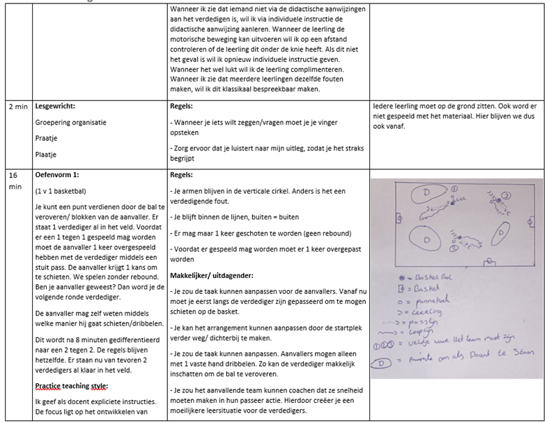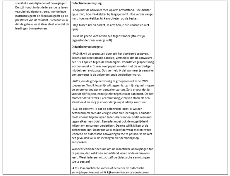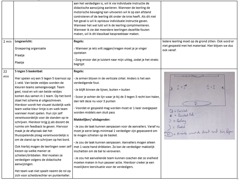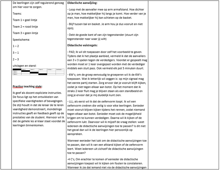 Wanneer ik terugkijk naar mijn gegeven les waren er zeker nog verbeterpunten. Door de doceerstyle die ik heb toegepast heb ik alle kennis en didactische aanwijzingen kunnen benoemen en demonsteren. De doceerstyle heeft mij ook geholpen om de les zo te structureren dat de vrijheid die de leerlingen kregen beperkt bleef. Ik heb 1 keer Joep moeten aanspreken, omdat ik zijn aandacht niet kreeg bij een lesgewricht. Nu weet ik niet of dit iets te maken heeft met vrijheid in gebondenheid. Ik kan dus stellen dat het fijn was om deze doceerstyle toe te passen bij deze klas. Ik heb de leerlingen klassikale keuzes geven (keuze in samenwerking partner & niveau) maar ook individuele keuzes. Zo wouden 2 meiden naar de wc. De 2 meiden mochten van mij tijdens de oefenvorm naar de wc te gaan (vrijheid), alleen mochten zij niet tegelijkertijd naar de wc (gebondenheid). Uit het evalueren met de leerlingen bleek dat de oefenstof te makkelijk haalbaar was. Uit mijn eigen observatie bleek dat de leerlingen de didactische aanwijzingen wel begrepen en ook constant met hun man meeliepen en daardoor tussen bal en basket bleven. Wel vond ik dat 90% van de leerlingen te dichtbij of te ver van zijn man verdedigd. De afstand (armlengte) is dus iets om de volgende keer op door te gaan. Al moet ik wel zeggen dat het heel mooi was om te zien dat de intensiteit van het verdedigen erg hoog lag, terwijl dit normaal veel lager is tijdens een basketbal les. |