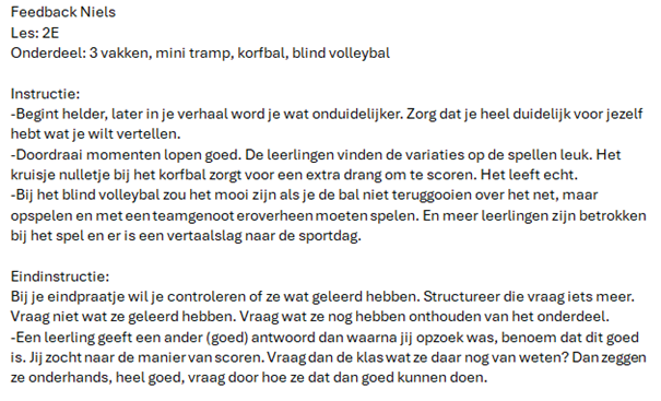 Ik merkte tijdens mijn eerste instructie van de les op 28-11 dat ik wat chaotisch overkwam bij de leerlingen. Er zat geen duidelijk verhaal in mijn instructie. Ik hield alle punten door elkaar. Ik ben actief bezig geweest met de feedback die ik kreeg vanuit mijn stagebegeleider. Ik kreeg als tip mee om uit te typen wat ik wil vertellen. Ook moest ik bedenken welke volgorde belangrijk is om de instructie te geven. Doordat ik actief bezig ben geweest met de feedback die ik kreeg creëerde ik veel meer rust. Het verhaal was beter te volgen dan die van de eerste les. Ik wil op dezelfde manier doorgaan met het formuleren in mijn lesvoorbereiding in welke volgorde ik iets wil vertellen. Daarvan wil ik de kernwoorden opschrijven. Dit moet resulteren op een nog duidelijkere en volgbare instructie.