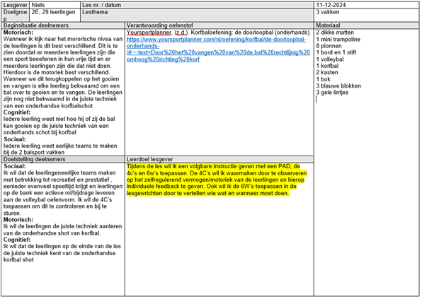 Bij de les van 12-12 heb ik mijn strategie opnieuw toegepast om mijn instructie uit te schrijven. Dit hielp mij door er een logisch en volg baar verhaal ervan te maken. Ook heb ik in deze les mijn leerdoel geformuleerd op verschillende didactische vuistregels. Nu is het zo dat beide vakken een andere doelstelling had voor de leerlingen. Bij het korfballen ging het om de techniek (motorisch) en bij het volleyballen ging het om het reguleren (sociaal). Hierdoor moest ik de 4C’s op verschillende manieren toepassen. De 4C’s toepassen om een vaardigheid aan te leren ben ik al bekwaamd in. Om ervoor te zorgen dat er eerlijke teams werden gemaakt, eenieder evenveel speeltijd krijgt en leerlingen op de bank een actieve rol/bijdrage zouden leveren aan oefenvorm was voor mij nieuw. Tijdens de les was ik hiermee aan het experimenteren. Als eerst heb ik geobserveerd en keek ik naar het zelfregulerend vermogen van de leerlingen. De leerlingen kwamen er gezamenlijk niet uit wie er moesten spelen en wie er op de bank zouden wachten. Ik heb procesgerichte feedback gegeven door vragende wijs de leerlingen helpen/ stimuleren. De leerlingen pakte het direct op en er waren binnen enkele seconden 2 teams van 3 leerlingen in het veld. Het probleem daarna was dat er dus 2 meiden aan de zijkant zaten die direct een gesprek begonnen wat niet over de oefenvorm ging. Hun heb ik ook procesgerichte feedback gegeven door te vragen wat voor rol hun zouden kunnen nemen aan de zijkant. Er was direct effect, want de 2 meiden waren direct bezig met het spel en de punten bijhouden. De 6W’s heb ik ook toegepast tijdens de lesgewrichten en het afsluiten van de les. Tijdens mijn laatste fluitsignaal vroeg ik aan de leerlingen of hun de lintjes en de ballen wouden opruimen. Nu heb ik niet specifiek benoemt waar de materialen heen moeten. Bij deze klas ging het nog goed. Alleen het kan zijn dat er in een andere klas leerlingen zijn die de materialen in de hok leggen maar dit niet netjes doen. De volgende keer wil ik duidelijk benoemen waar het materiaal heen moet. Als feedback kreeg ik mee van mijn stagebegeleider dat het evalueren met de leerlingen nog moeizaam ging. Hier ben ik mee eens. Ik moest mijn best doen om sturing te geven aan het actief evalueren met de leerlingen. Mijn motorische leerdoel kwam moeizaam terug bij de leerlingen en het sociale leerdoel kwamen we niet eens aan toe om die te bespreken. Ik wil de volgende keer werken aan het evalueren met de leerlingen. Ik wil ze actief hierbij betrekken. Dit wil ik laten lukken om directer te vragen wat ze hebben geleerd. Voor deze leeractiviteit ben ik 120 minuten bezig geweest met het voorbereiden en het geven van de les. Ik ben 120 minuten bezig geweest met het uitwerken van de leeractiviteit. Dit is in totaal 4 uur.