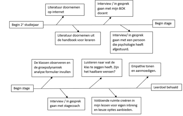 In het begin van het volgend semester wil ik een overleg inplannen waarbij het hele vaksectie aanwezig is. Ik wil al mijn leerdoelen bespreekbaar maken en hier een passende leerroute bij bedenken. Bij dit overleg wil ik openstaan voor andere ideeën en inzichten.