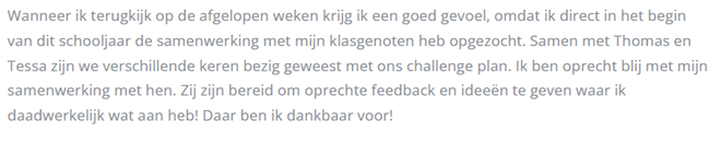 Ik vond de communicatie erg fijn tussen de samenwerkingspartners. Iedereen stond open om mij te helpen. Ik vond dat ik een open houding had richting de rest. Ik ben trots op als ik hierop terugkijk. Ik had een productieve en positieve werkhouding.