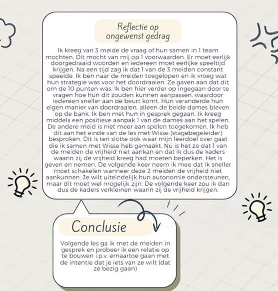 Door samen met klasgenoten af te spreken hebben wij elkaar feedback kunnen geven en ideeën kunnen delen. Doordat wij allemaal een ander idee hadden op welke wijze wij wilden werken konden we van elkaar leren. Ook zijn Thomas Blok en ik samen met onze stagebegeleiders gaan overleggen en zijn wij periode 1 gaan doornemen. Ook hebben wij de hele stageperiode nabesproken met onze stagebegeleiders. Dit deden wij op onze vorige stage namelijk niet. Hier namen wij nu echt de tijd voor en hadden we dit tijdig afgesproken. Door experts te interviewen kan ik achter nuttige en actuele informatie komen wat ik meeneem in mijn lesgeven. Door de situatie omtrent ongewenst gedrag voor te leggen bij de coördinator kreeg ik ook bruikbare informatie. In deze informatie vertelde ze wat de actuele situaties waren van de betreffende leerlingen. Het is voor sommige leerlingen niet de eerste keer dat ze zulk ongewenste gedrag vertonen. Ze gaf aan dat ik dat gedrag altijd moet terugkoppelen bij de coördinator. Dit neem ik dus ook mee voor de volgende keer als er zich een heftige situatie voordoet in mijn les.